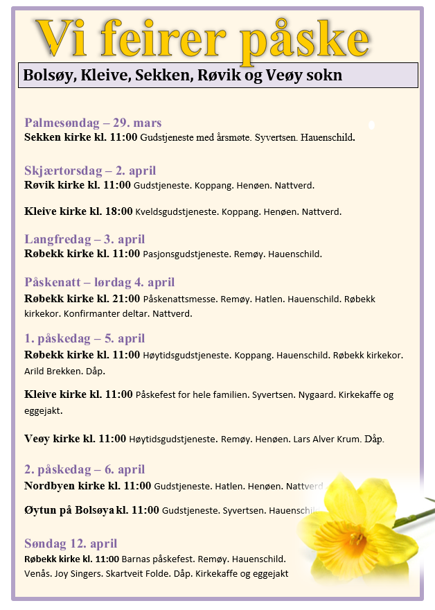 Velkommen til å feire påsken i Røvik og Veøy, Kleive, Sekken og Bolsøy sokn!